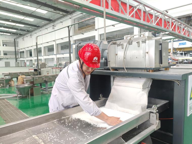 记者在泾渭新材料公司生产现场看到,聚烯烃原料经过混炼、挤出、拉条等工序,源源不断进入切粒机,被切割成大米一般进入均化仓,进一步稳定性能并烘干后进入包装工序,工作人员装袋、封口忙而有序。